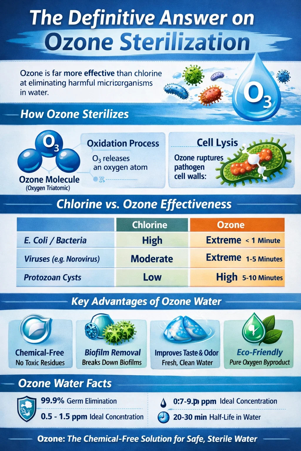 Kimyasal katkı maddelerinin aksine ozon, moleküler oksidasyon süreciyle sterilize eder. Patojenlerin hücre duvarlarını fiziksel olarak parçalayarak direnç geliştirememelerini sağlar. İşlem tamamlandığında ozon molekülü (O3) doğal olarak saf oksijene (O2) geri döner ve geride hiçbir toksik kalıntı içermeyen temiz, steril sudan başka bir şey kalmaz.