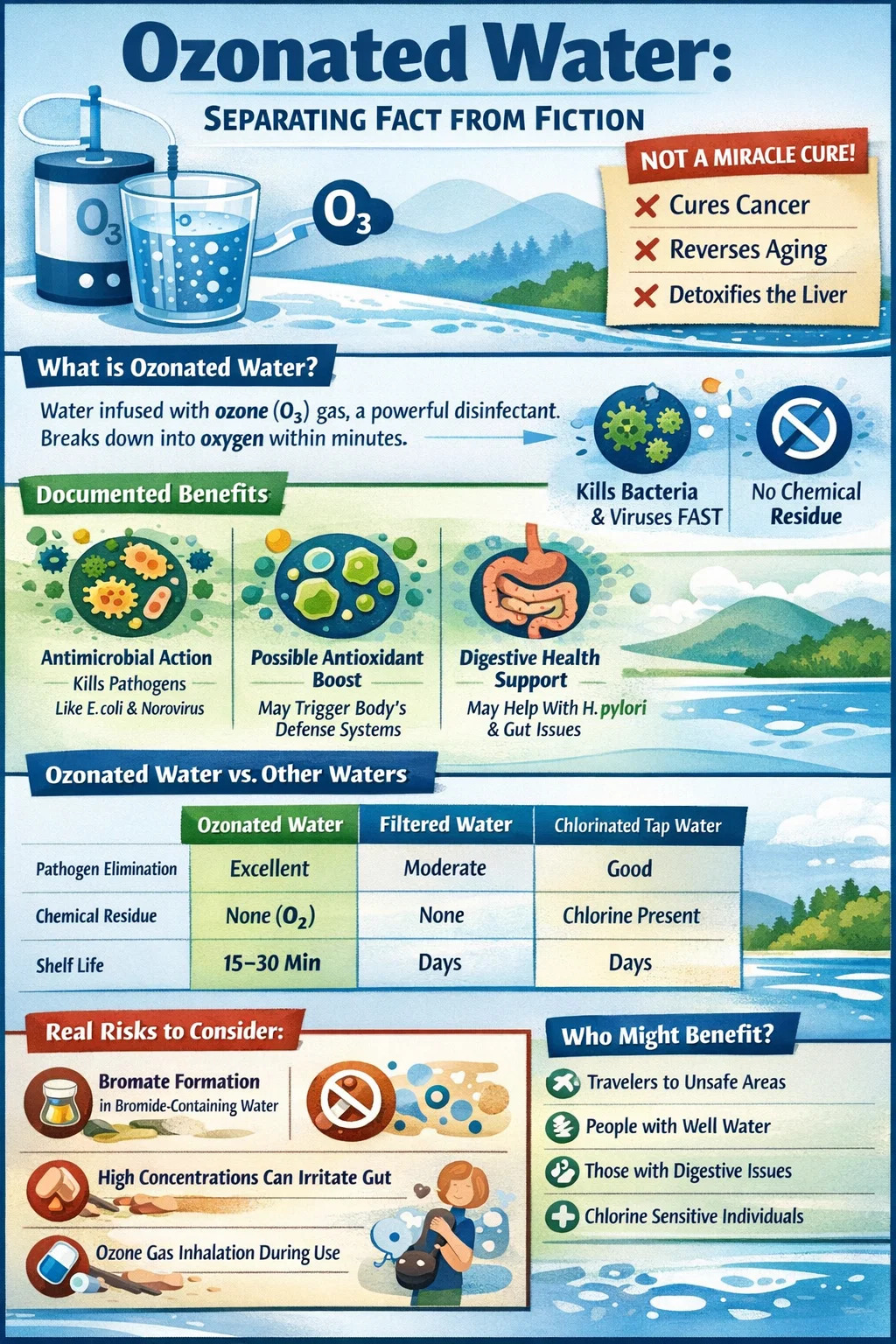 Ozonlanmış su, gerçek, belgelenmiş faydalarıyla, özellikle de kimyasal kalıntı bırakmadan patojenleri ortadan kaldırma konusundaki olağanüstü yeteneğiyle meşru bir su arıtma aracı olarak yerini almaktadır. Aynı zamanda antioksidan savunmaları ve ağız sağlığını desteklediğine dair umut verici (henüz kesin olmasa da) kanıtlar gösteriyor. Kaliteli bir cihazdan uygun konsantrasyonlarda kullanıldığında ve taze olarak tüketildiğinde çoğu sağlıklı yetişkin için güvenlidir.
